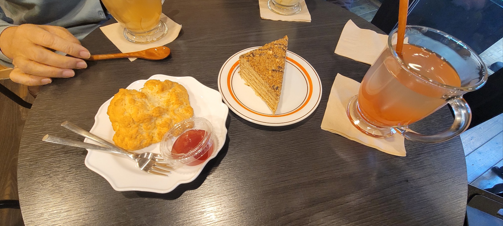 과일청 음료와 스콘 케잌을 먹었습니다.