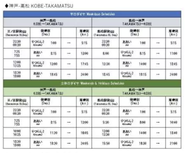 4시간 걸리는 다카마쓰에서 고베 행 페리는 하루에 여러 차례 있고, 낮 운행도 쇼도시마에서 정차한다. 야간 페리는 새벽 1시에 출발해 오전 5시 15분 고베 도착으로 야간 숙박비는 물론 시간도 절약된다.