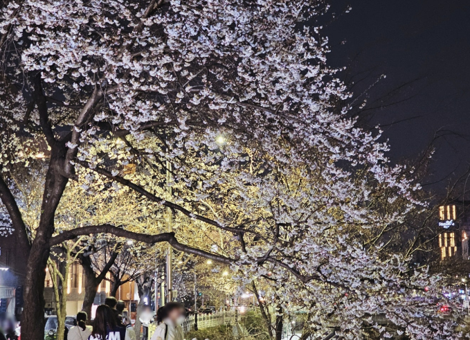 청계천은 도심 한가운데서 벚꽃을 즐길 수 있는 명소로, 산책로를 따라 흐드러지게 핀 벚꽃이 아름답습니다.